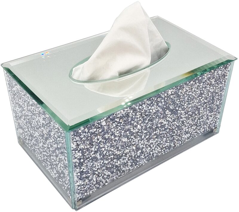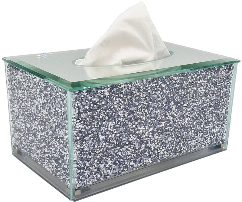 Szklane pudełko na chusteczki z kryształami po bokach (z każdej strony) oraz lustrzaną górą. Spód pojemnika plastikowe, otwierany na magnesach.
