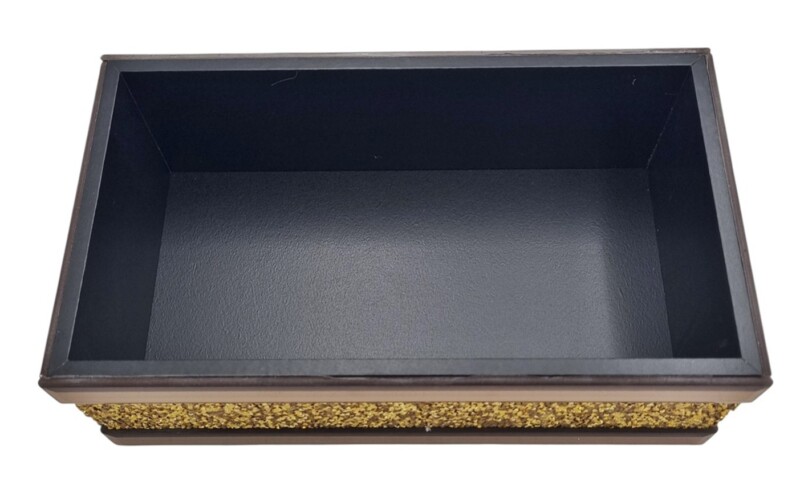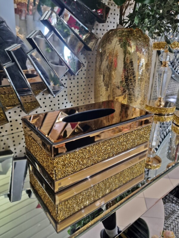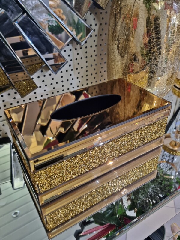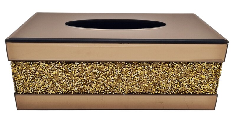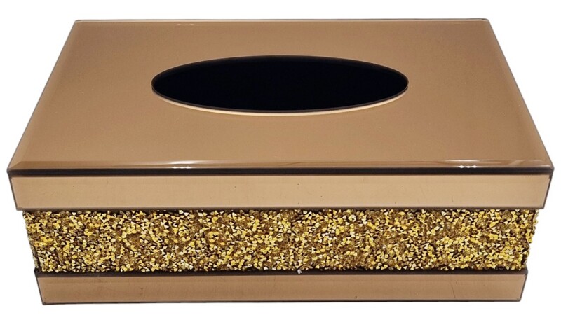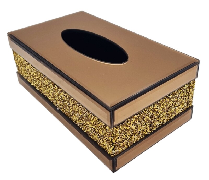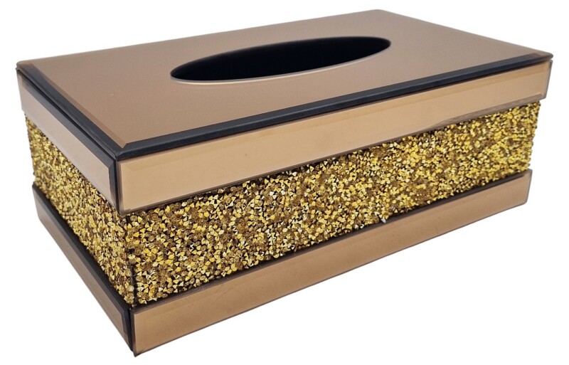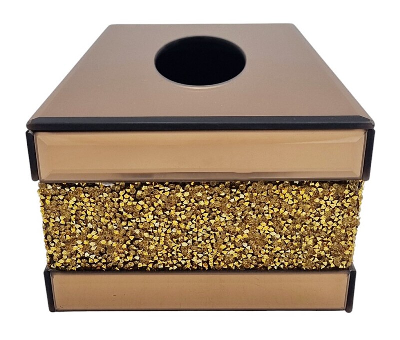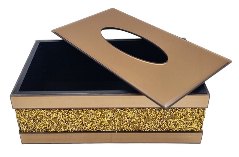 Chustecznik dekoracyjny glamour w eleganckim odcieniu szampańskiego złota to stylowy i funkcjonalny dodatek do wnętrz. Model posiada zdejmowaną górę z otworem, co ułatwia szybkie i wygodne uzupełnianie chusteczek (zmieści całe pudełko). Wnętrze wykonane jest z płyty MDF, zapewniającej stabilność oraz trwałość użytkowania.