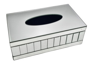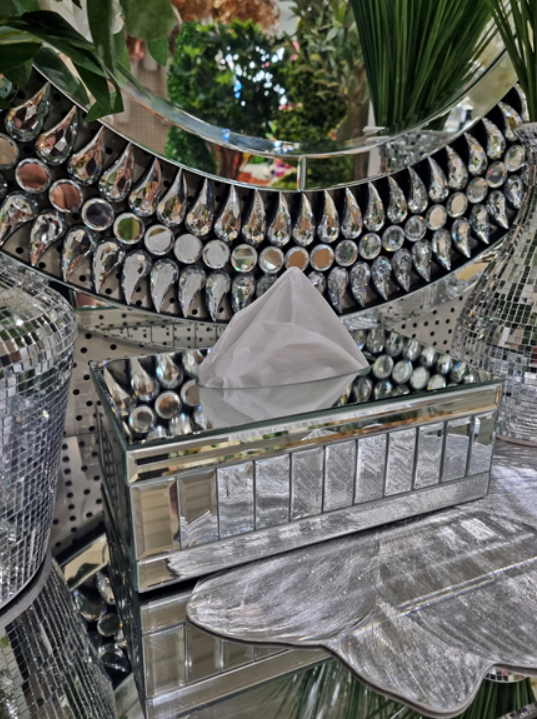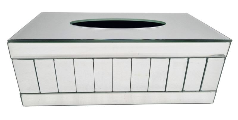 Elegancki lustrzany chustecznik / dekoracyjne pudełko na chusteczki. Dno pojemnika jest plastikowe, a otwór w kształcie owalu.