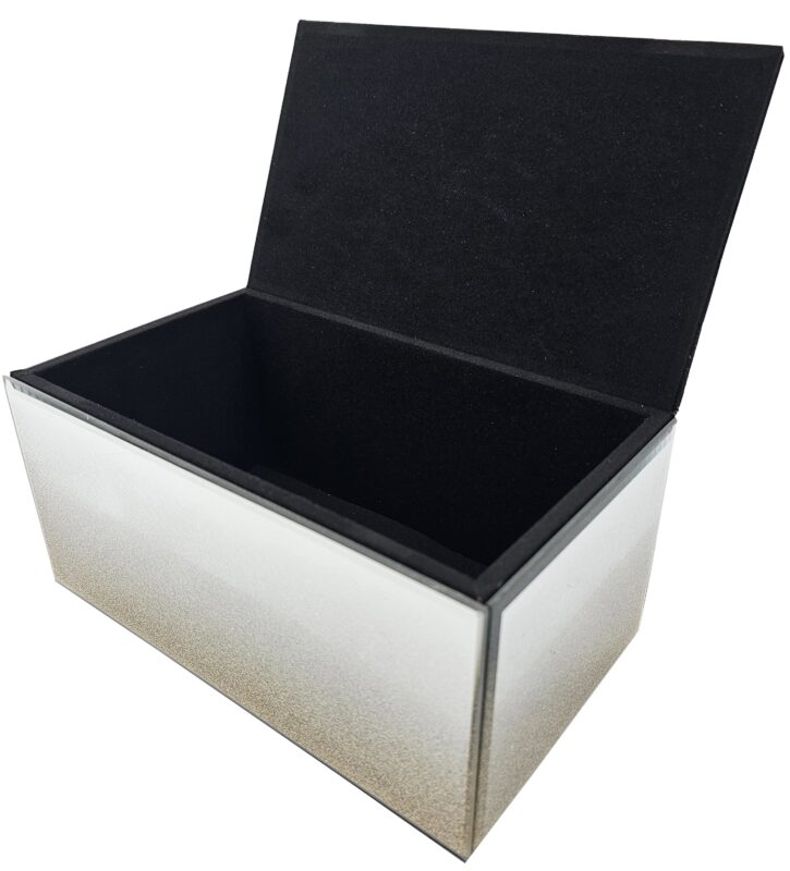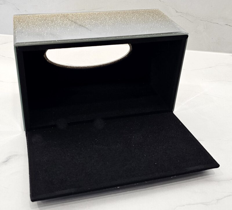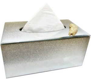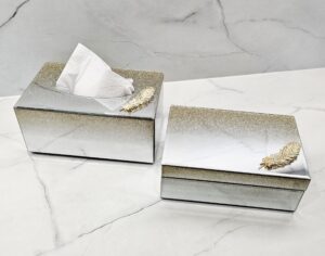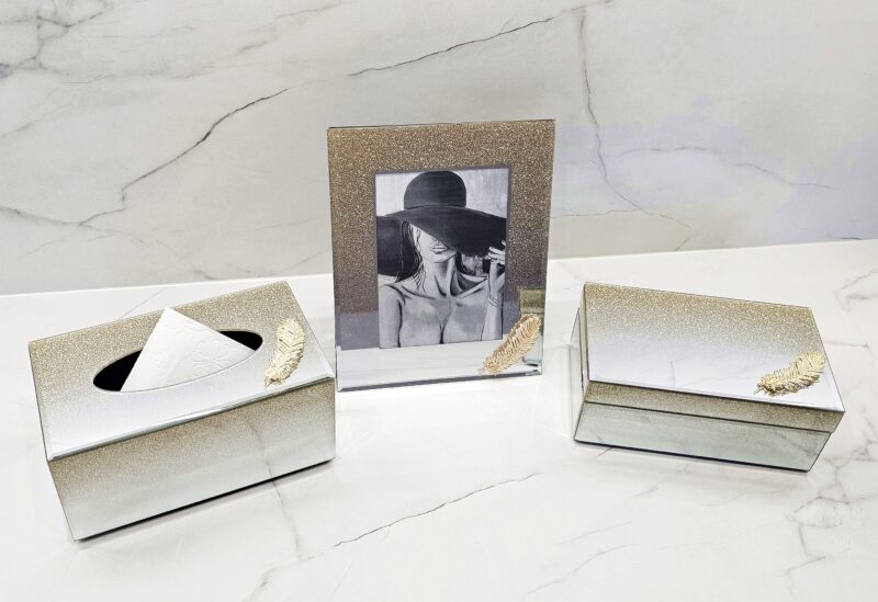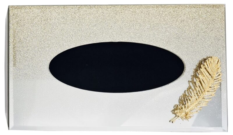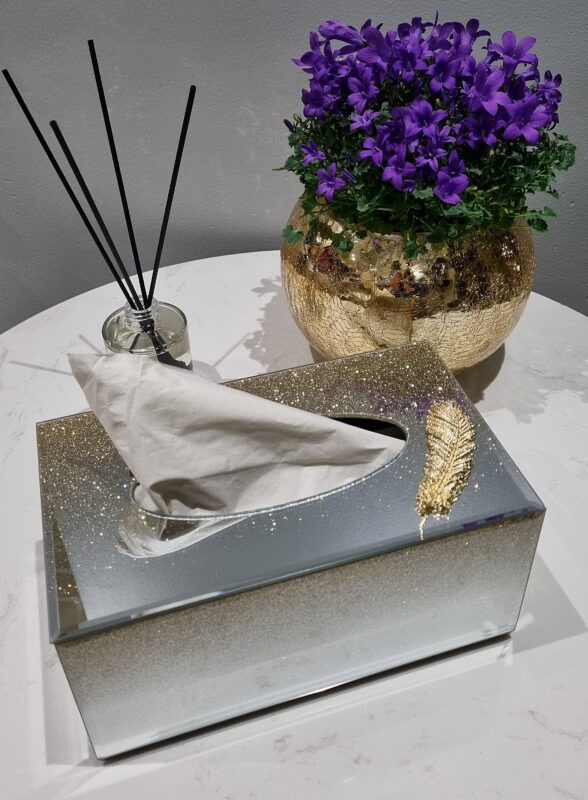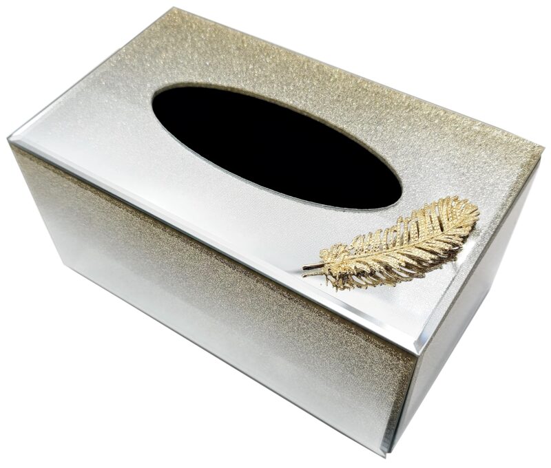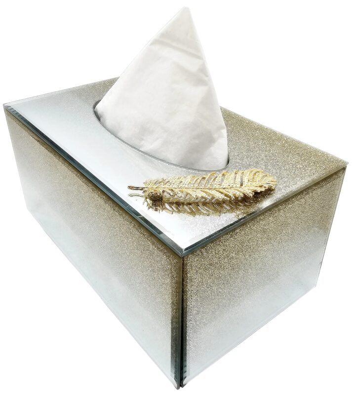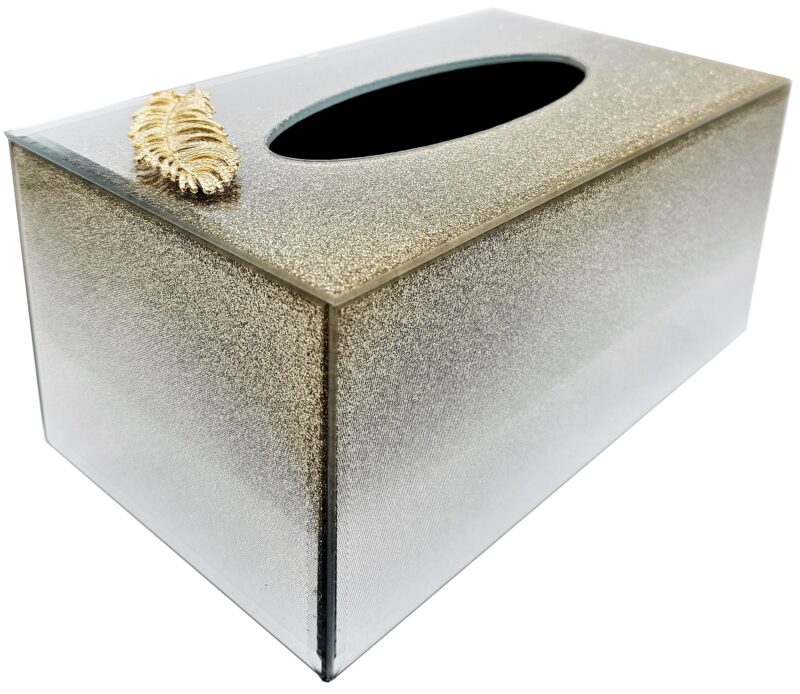 Lustrzane pudełko na chusteczki z efektem brokatowego ombre i dekoracyjnego złotego piórka.