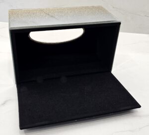 Łatwość wkładania chusteczek do środka, wystarczy podnieść dolną ściankę. Spód otwierany za pomocą magnesów umieszczonych w ściankach. (magnesy zabudowane, niewidoczne)