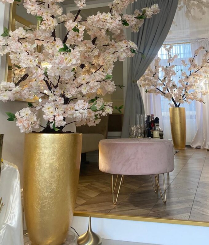 Wysoka, ekskluzywna donica z mieszanki gipsu, żywicy poliestrowej i alabastru.