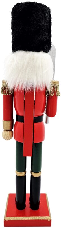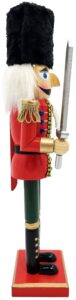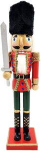 Figurka wykonana z drewna, przedstawiająca dziadka do orzechów stojącego na prostokątnym podeście z mieczem i czapką na głowie. Figurka dziadka do orzechów to nieodłączny element świąt Bożego Narodzenia.