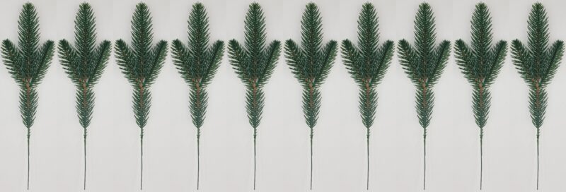 Aukcja dotyczy zestawu 10 sztucznych gałązek świerkowych.