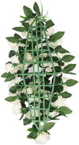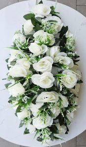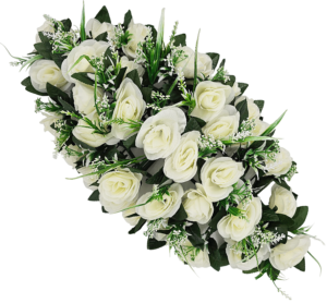 Kompozycja składa się z 35 kwiatów róży z listkami i dodatkami.