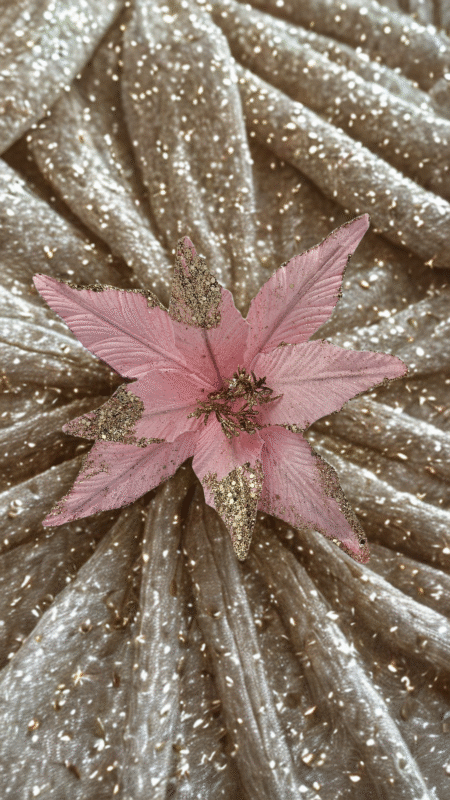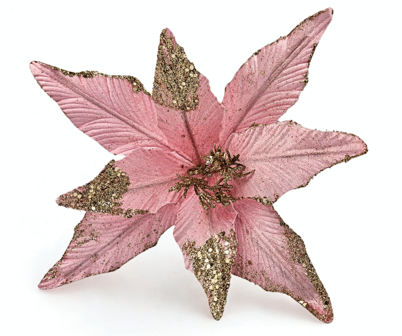Kwiat wykonany z bardzo dobrej jakości materiału welurowego, miękkiego i przyjemnego w dotyku pokrytego pięknie mieniąca się brokatem.