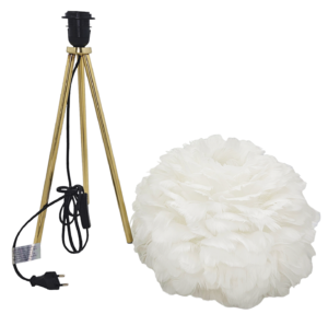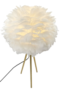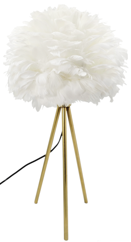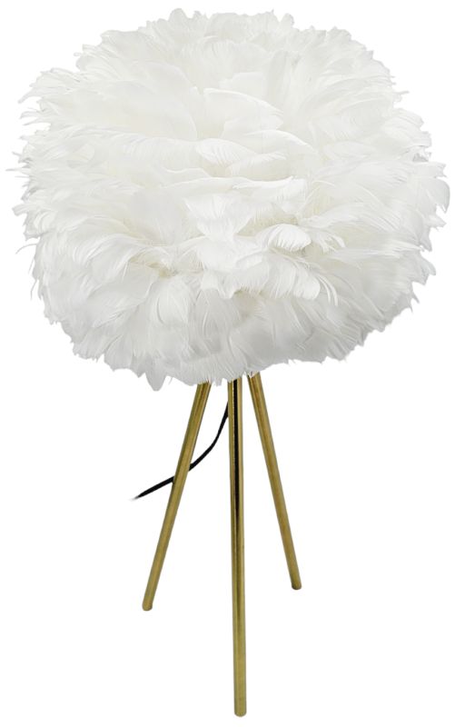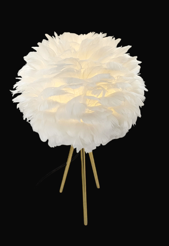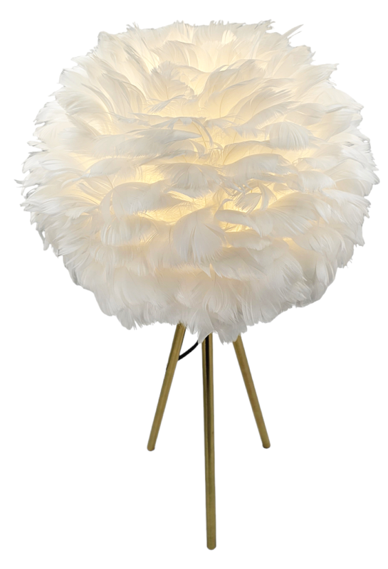 Puch umocowany jest na stabilnej konstrukcji, którą podtrzymują trzy, subtelne, złote nogi. Jest to lampa nowoczesna, designerska. Jej przenikające przez pióra światło wyczaruje we wnętrzu atmosferę pełną spokoju i przytulności.