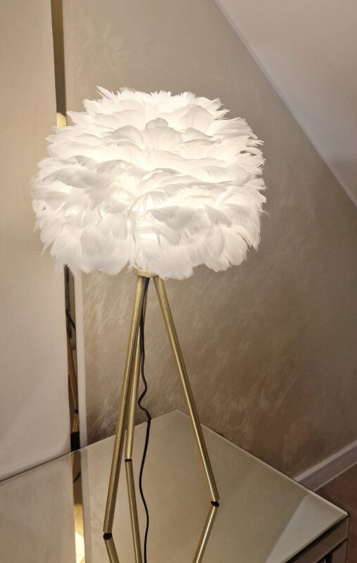 Efektowna lampka z białym kloszem z piór.