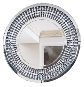 Lustrzana, fazowana rama inkrustowana piękną ozdobą rozświetli oraz optycznie powiększy pomieszczenie subtelnie odbijając światło.