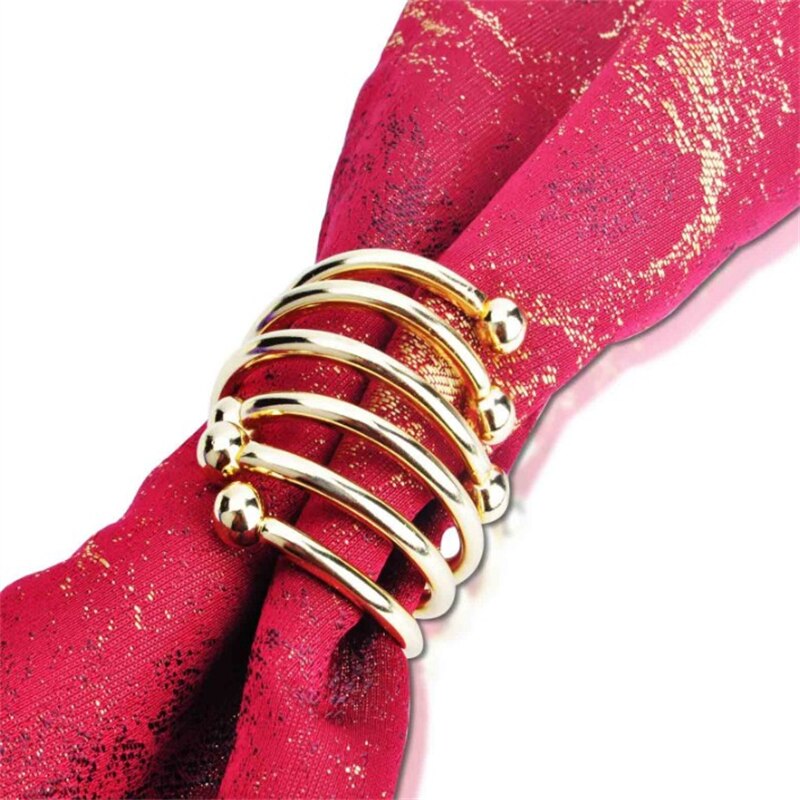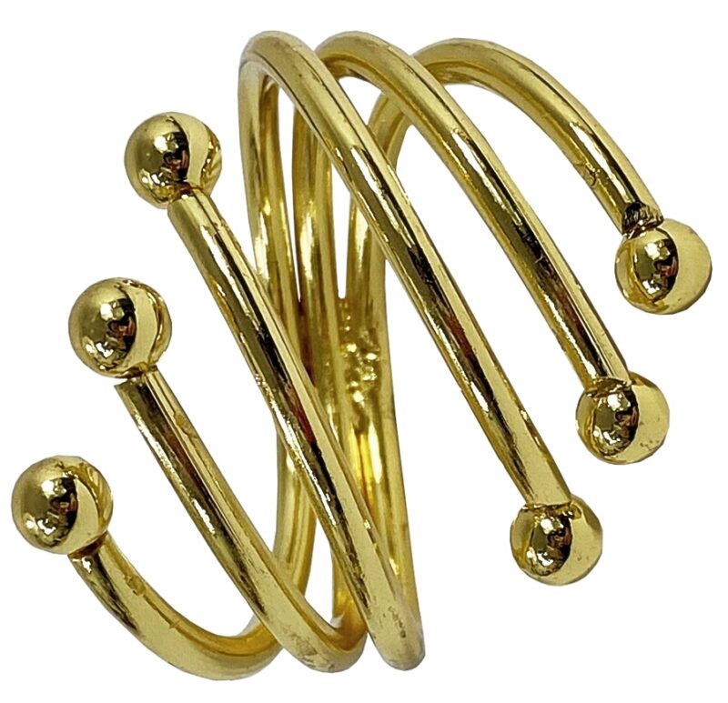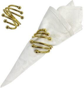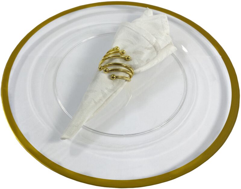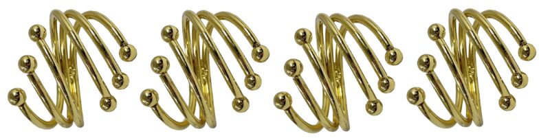 Zestaw zawiera 4 sztuki obrączek na serwetki, który świetnie sprawdzi się do dekoracji stołu. Złote pierścienie umieszczone z serwetą na talerzach lub dekoracyjnych podkładkach tworzą efektowną całość.