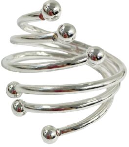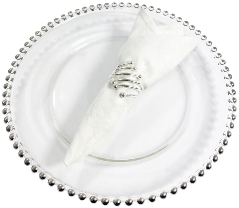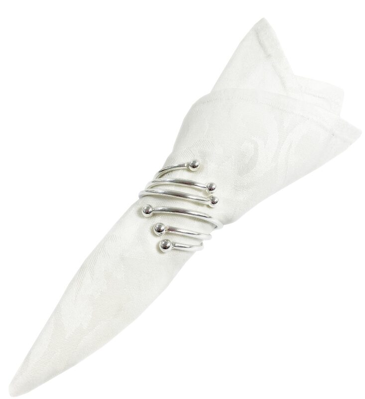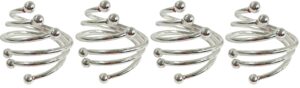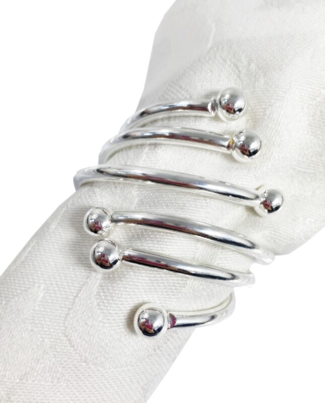 Zestaw zawiera 4 sztuki obrączek na serwetki, który świetnie sprawdzi się do dekoracji stołu. Srebrne pierścienie umieszczone z serwetą na talerzach lub dekoracyjnych podkładkach tworzą efektowną całość.