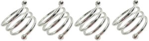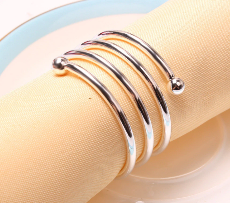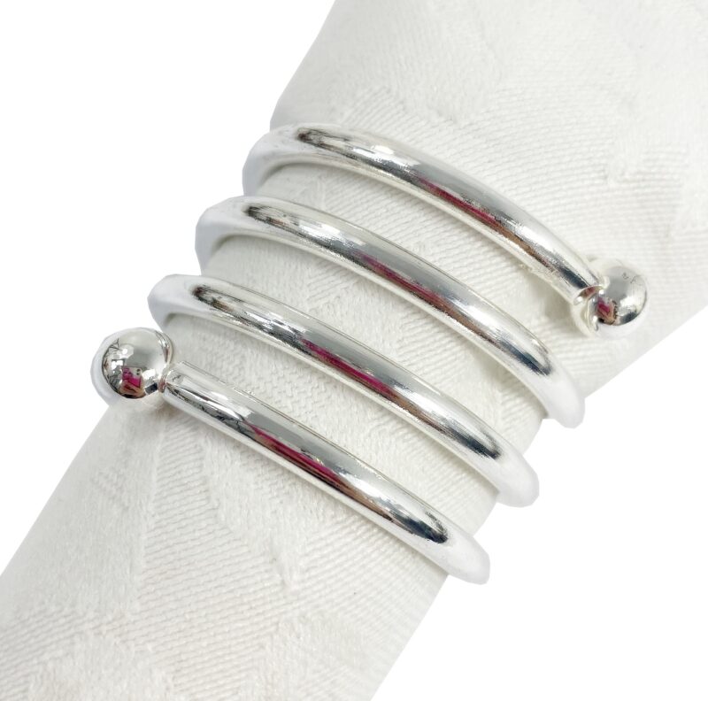Zestaw zawiera 4 sztuki obrączek na serwetki, który świetnie sprawdzi się do dekoracji stołu. Srebrne pierścienie umieszczone z serwetą na talerzach lub dekoracyjnych podkładkach tworzą efektowną całość.