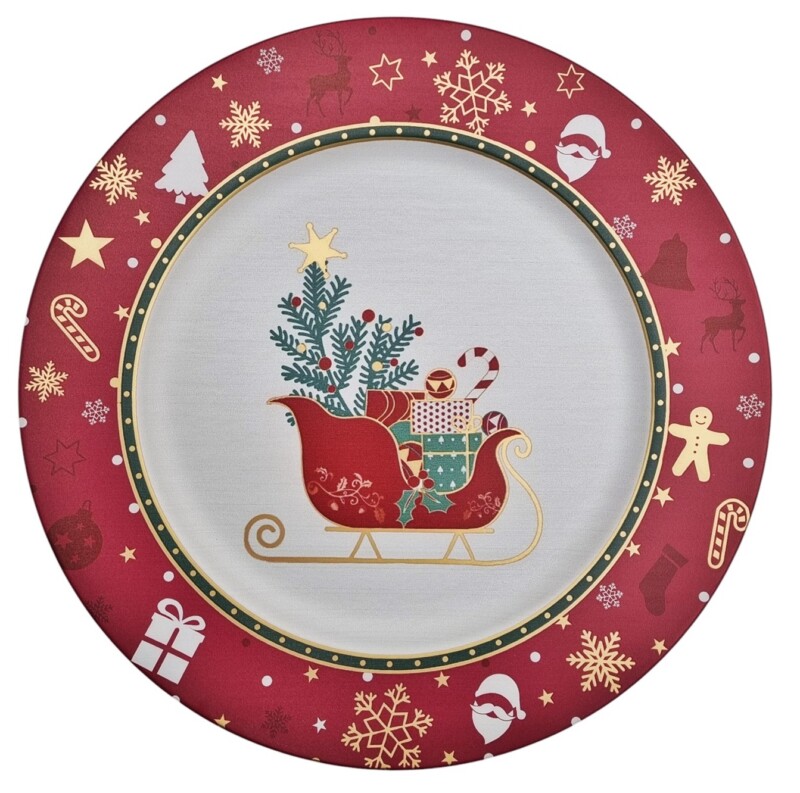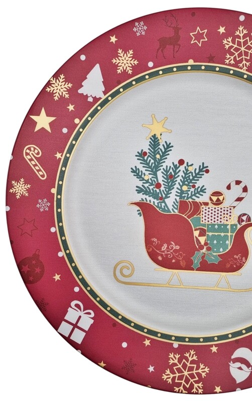 To jest podtalerz dekoracyjny z motywem świątecznym. Wzór obejmuje sanie świętego Mikołaja oraz inne tematyczne świąteczne wzorki: bombki, śnieżynki, prezenty etc.