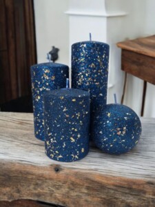 Powierzchnia świecy jest pokryta brokatem oraz drobinkami w kolorze złotym, które mienią się w świetle, tworząc efektowne refleksy i dodając całości wyrafinowanego wyglądu. Złote drobinki sprawiają, że świeca wygląda jak mały klejnot, który przyciąga wzrok i wprowadza do wnętrza odrobinę luksusu.