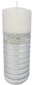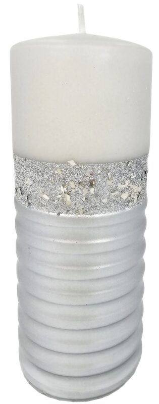 Świeca ozdobna z dodatkiem brokatu, który nadają jej nowoczesnego i eleganckiego wyglądu.