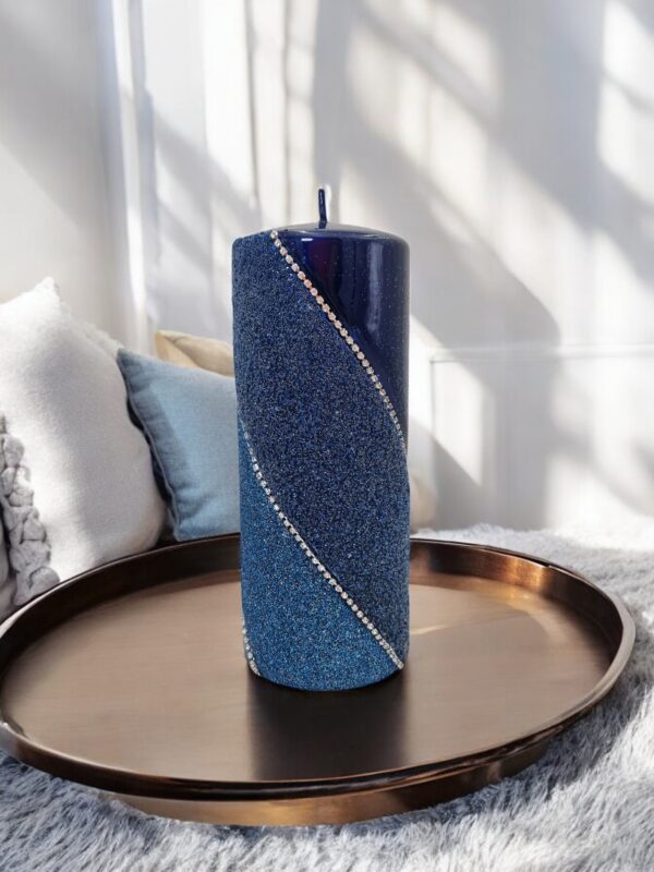 Główną ozdobą tej świecy jest subtelny pasek z imitacją diamencików, który biegnie dookoła jej powierzchni. Diamenciki mienią się w świetle, tworząc efektowne refleksy, które przyciągają wzrok i dodają całości wyrafinowanego blasku. Pasek z diamencikami nadaje świecy luksusowy wygląd, który sprawia, że staje się ona centralnym punktem każdej aranżacji.