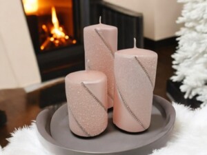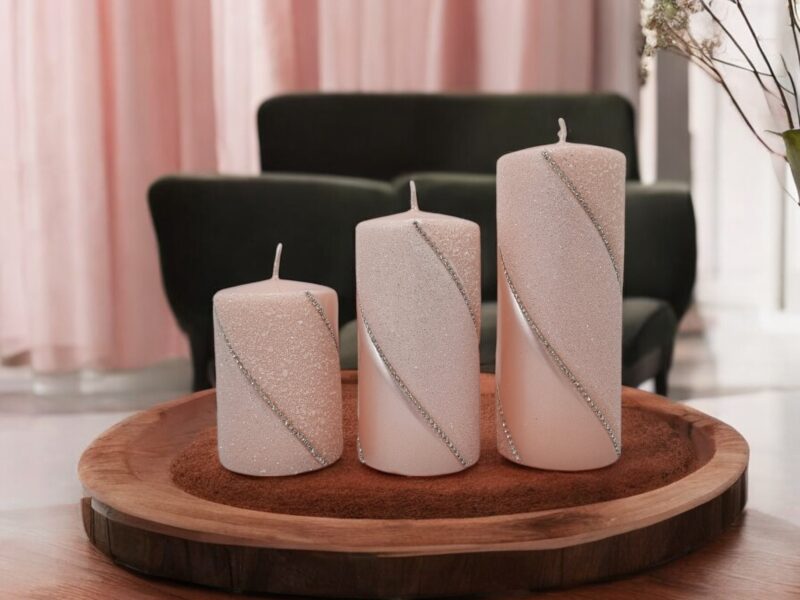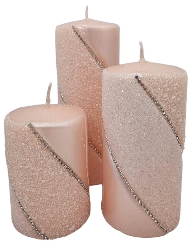Świeca z diamencikowymi paskami dookoła to prawdziwy klejnot wśród dekoracji, który wprowadza do wnętrza elegancję i luksus. Wykonana z najwyższej jakości wosku, świeca ma klasyczny, cylindryczny kształt, który doskonale komponuje się z różnymi stylami wnętrzarskimi. Dodatkowo świeca podzielona została na 3 części, z czego każda z nich o innej fakturze. Pierwsza z nich jest klasyczna, druga zaś brokatowa, trzecia i ostatnia ozdobiona małymi kuleczkami.