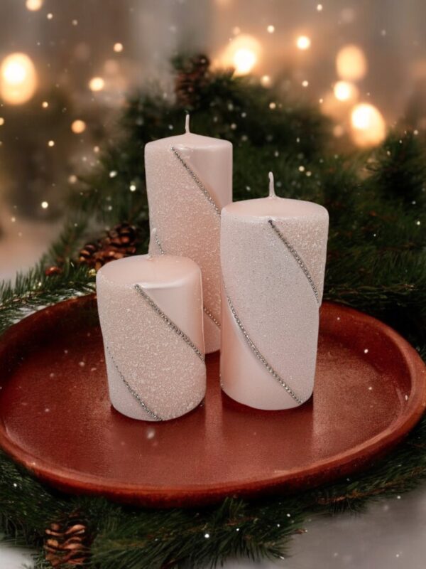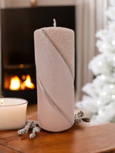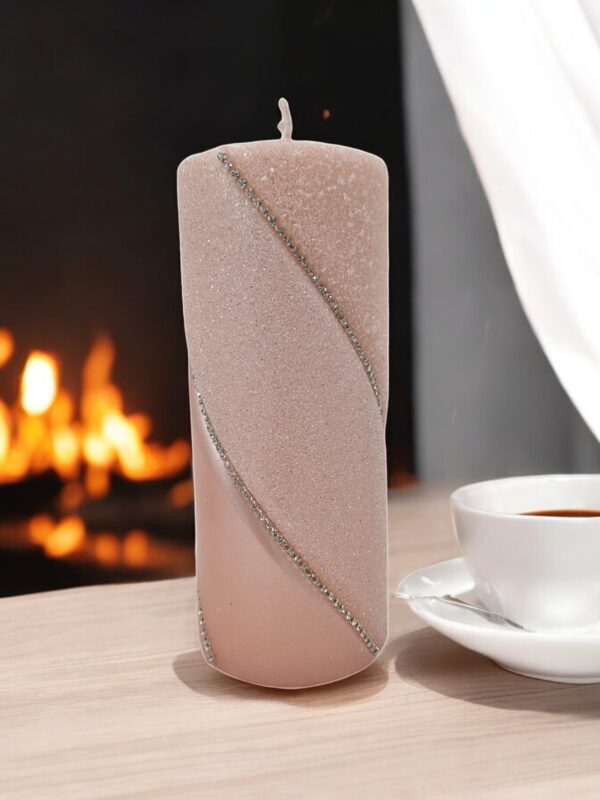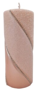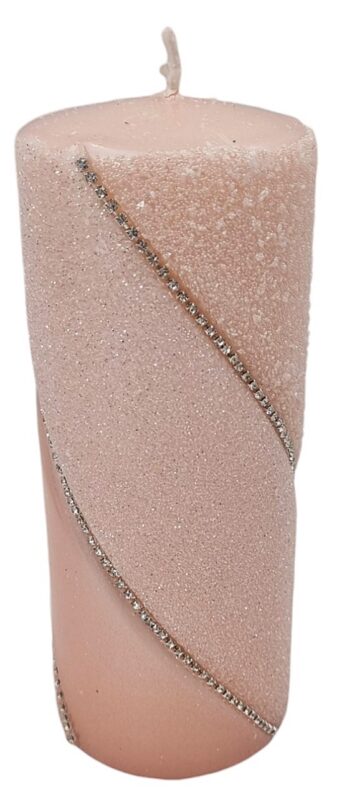 Główną ozdobą tej świecy jest subtelny pasek z imitacją diamencików, który biegnie dookoła jej powierzchni. Diamenciki mienią się w świetle, tworząc efektowne refleksy, które przyciągają wzrok i dodają całości wyrafinowanego blasku. Pasek z diamencikami nadaje świecy luksusowy wygląd, który sprawia, że staje się ona centralnym punktem każdej aranżacji.