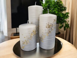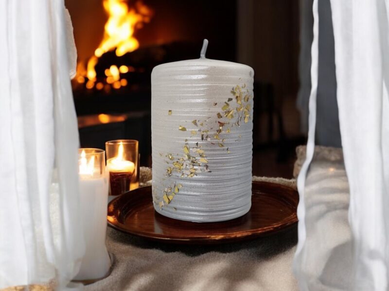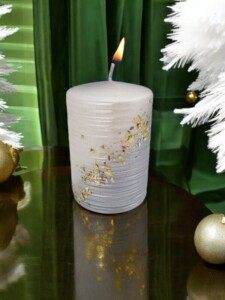 Powierzchnia świecy jest pokryta delikatnym brokatem oraz drobinkami w kolorze złotym, które mienią się w świetle, tworząc efektowne refleksy i dodając całości wyrafinowanego wyglądu. Złote drobinki sprawiają, że świeca wygląda jak mały klejnot, który przyciąga wzrok i wprowadza do wnętrza odrobinę luksusu.