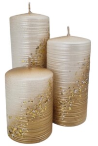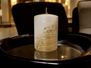Powierzchnia świecy jest pokryta delikatnym brokatem oraz drobinkami w kolorze złotym, które mienią się w świetle, tworząc efektowne refleksy i dodając całości wyrafinowanego wyglądu. Złote drobinki sprawiają, że świeca wygląda jak mały klejnot, który przyciąga wzrok i wprowadza do wnętrza odrobinę luksusu.