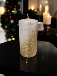Powierzchnia świecy jest pokryta delikatnym brokatem oraz drobinkami w kolorze złotym, które mienią się w świetle, tworząc efektowne refleksy i dodając całości wyrafinowanego wyglądu. Złote drobinki sprawiają, że świeca wygląda jak mały klejnot, który przyciąga wzrok i wprowadza do wnętrza odrobinę luksusu.