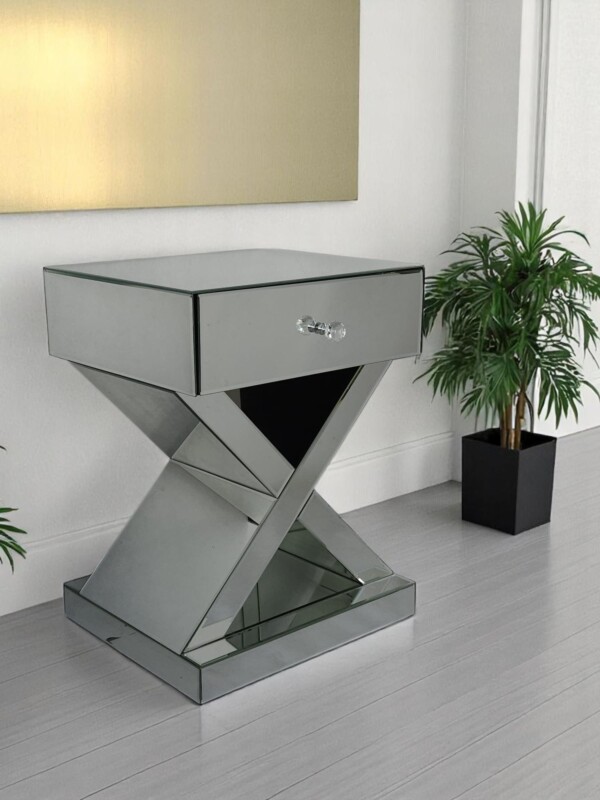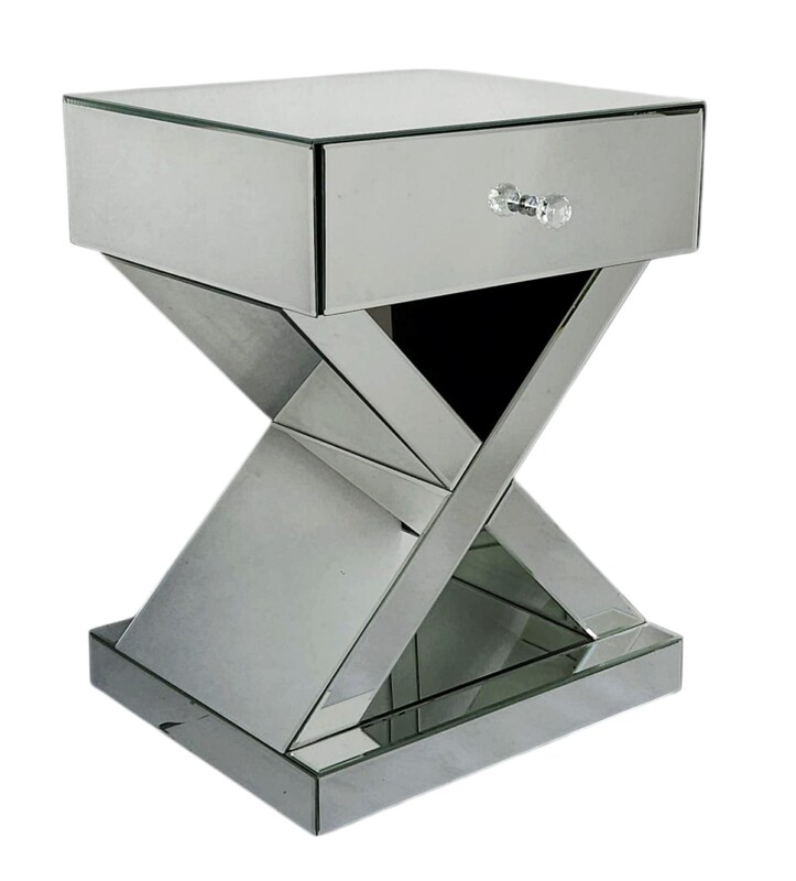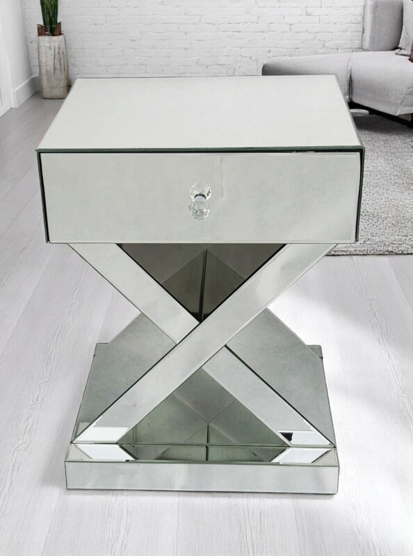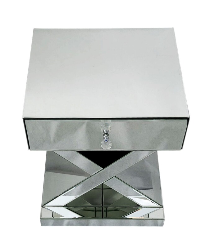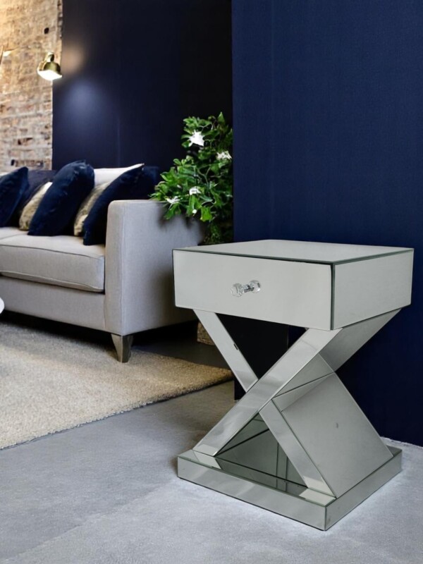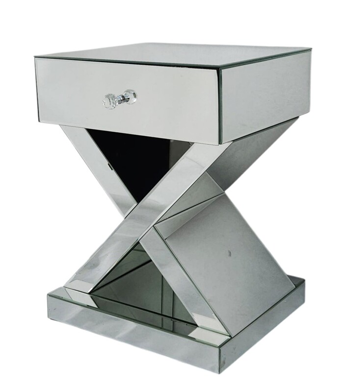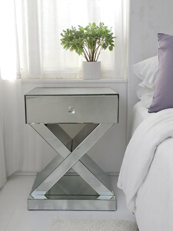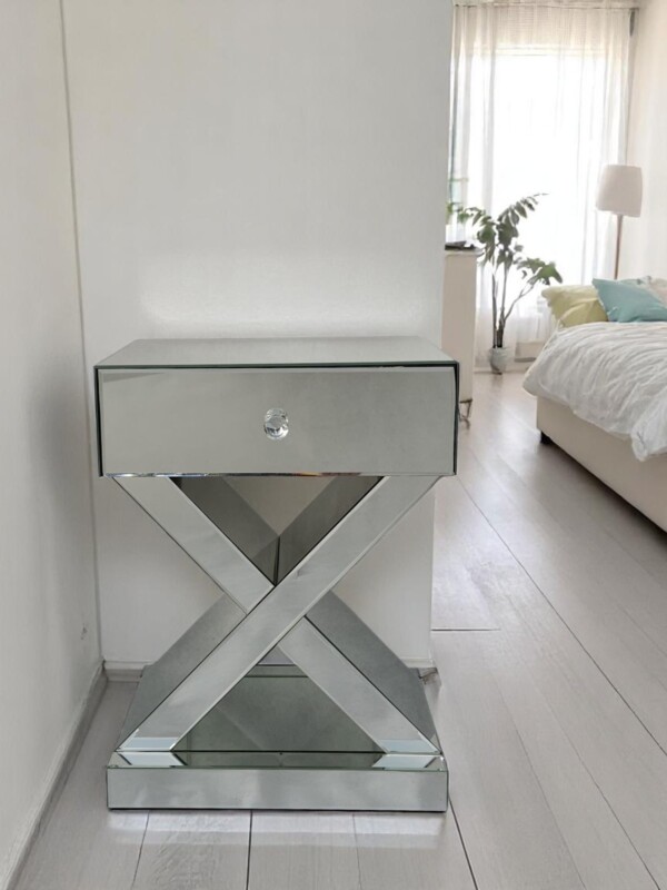 Stylowa szafka nocna z lustrzaną powierzchnią to idealny wybór dla osób ceniących sobie wyrafinowany styl glamour. Jej unikalna forma z geometryczną podstawą w kształcie litery „X” oraz szklany uchwyt szuflady dodają jej szyku i nowoczesności.