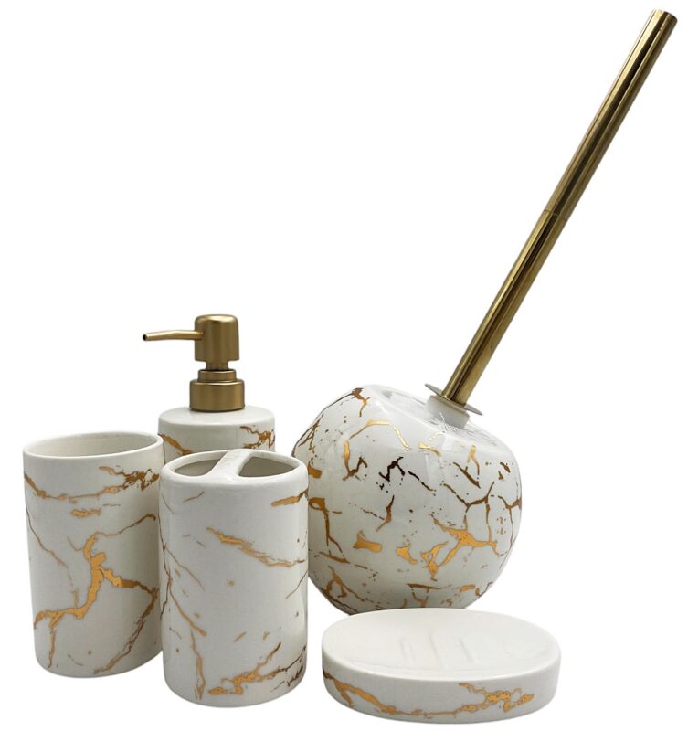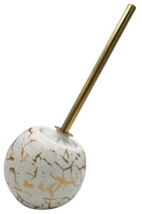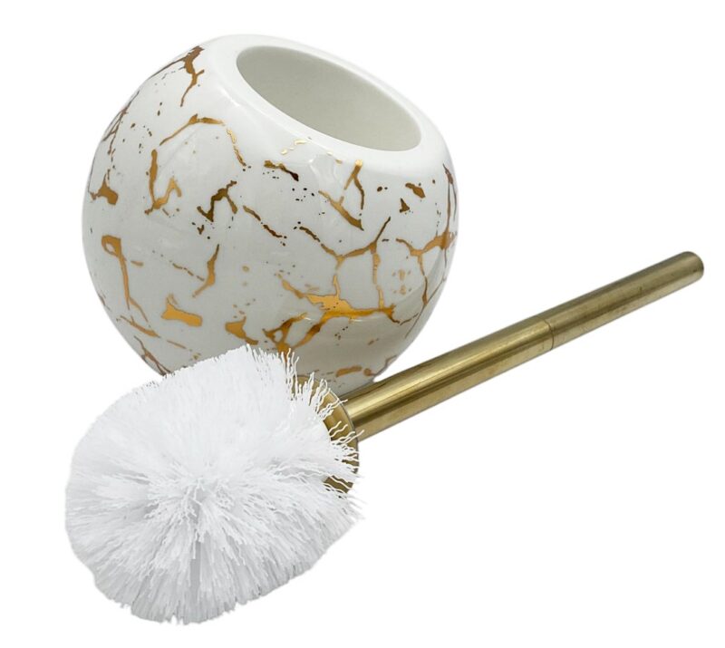 Akcesoria łazienkowe mogą być nie tylko praktyczne, ale również stylowe ! Właściwy design sprawia, że zwyczajna szczotka toaletowa staje się modnym dodatkiem dopełniającym aranżację pomieszczenia. Szczotka toaletowa z pojemnikiem w wzorze marmuru ze złotymi paskami. Produkt wykonany z materiałów wysokiej jakości, odpowiedni do stosowania w pomieszczeniach o dużej wilgotności. Włosie szczotki jest również wykonane z twardego tworzywa sztucznego. Szczotka do WC do samodzielnego skręcenia.