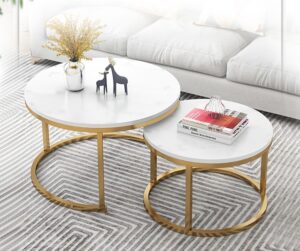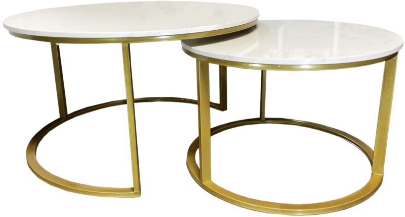 Efektowny zestaw dwóch stolików kawowych na złotej podstawie z blatem białego marmuru wspaniale sprawdzi się  we wnętrz, zwłaszcza tych, które cechują się stylem eleganckim, klasycznym lub nowoczesnym.